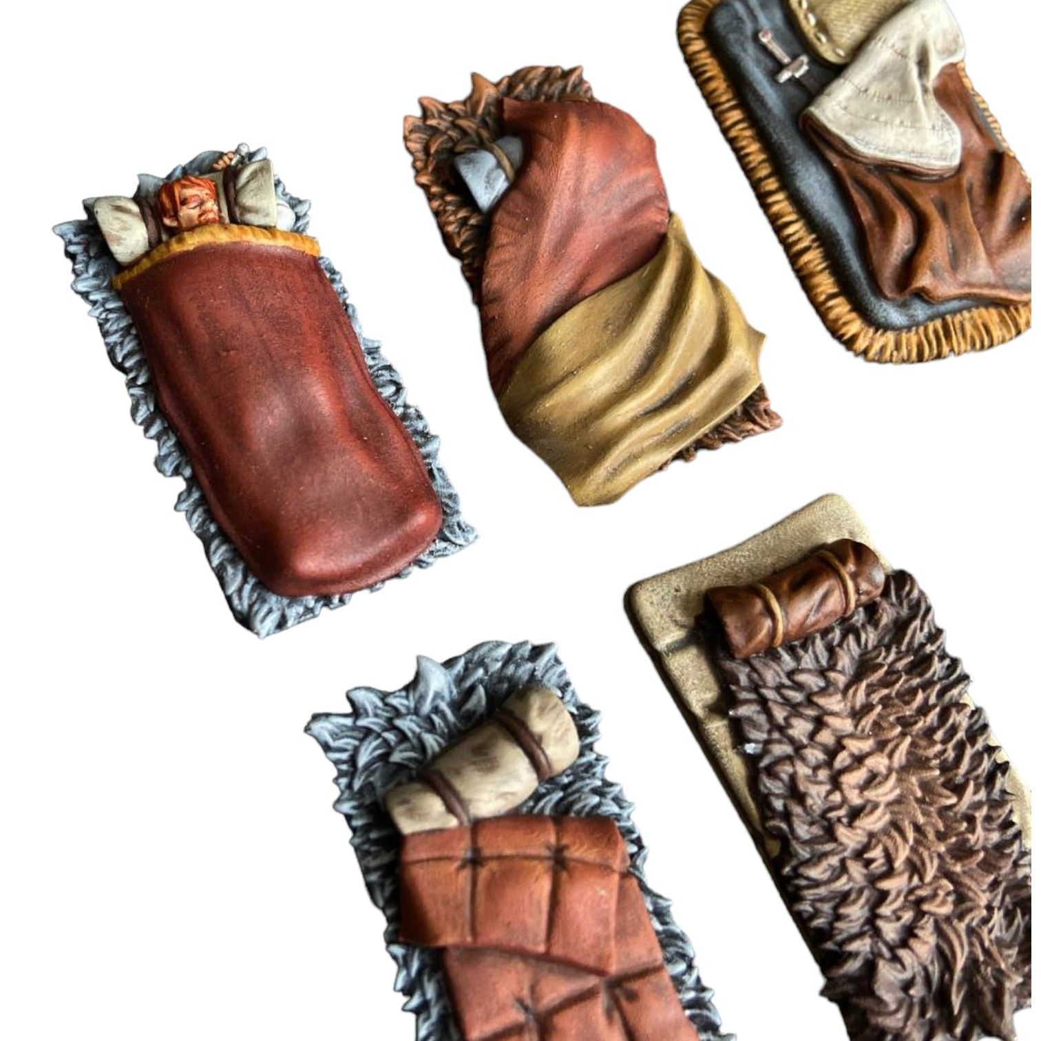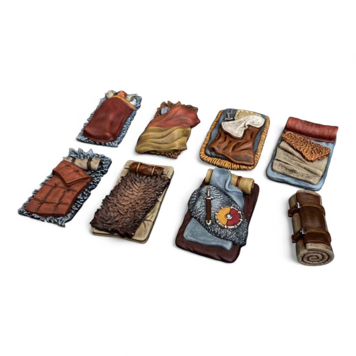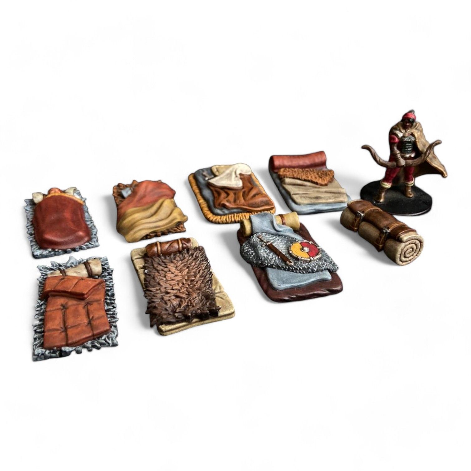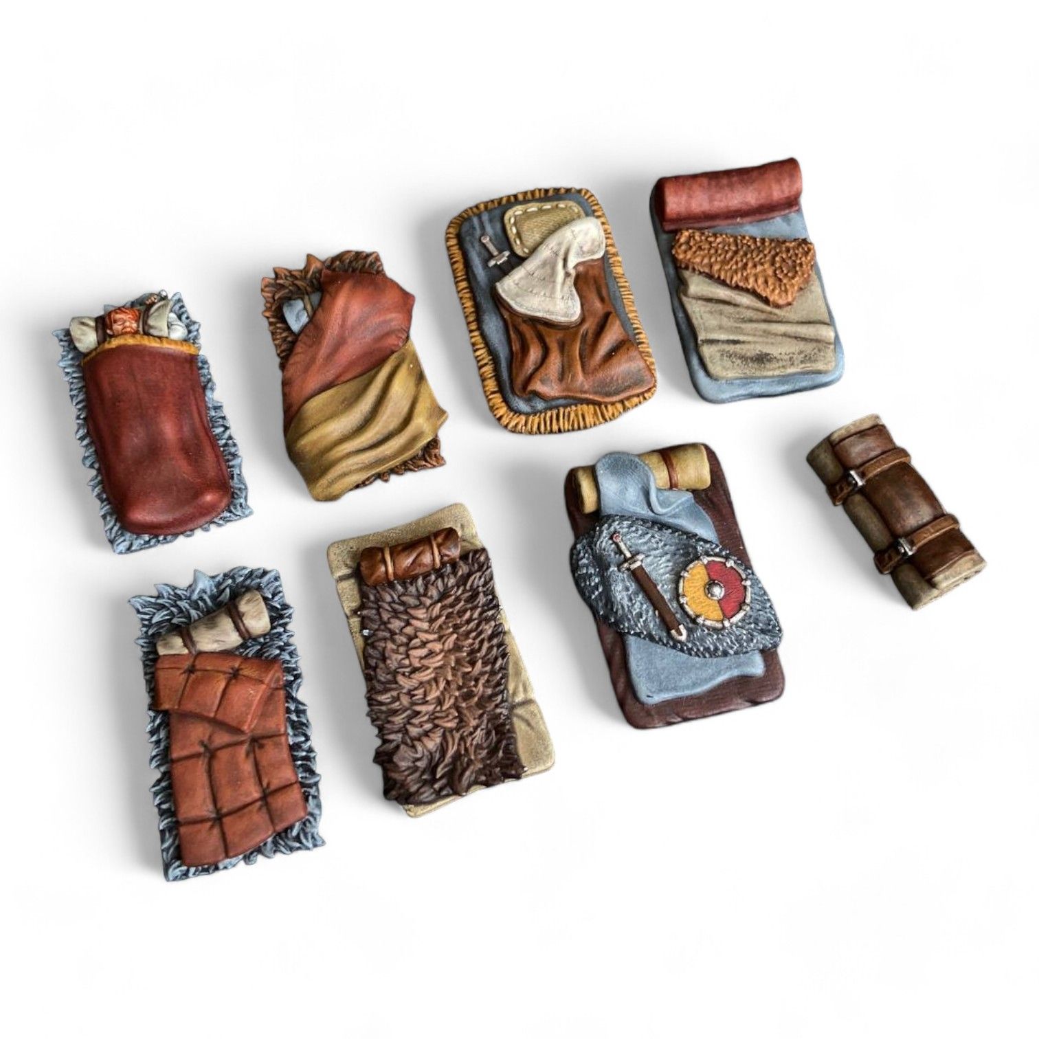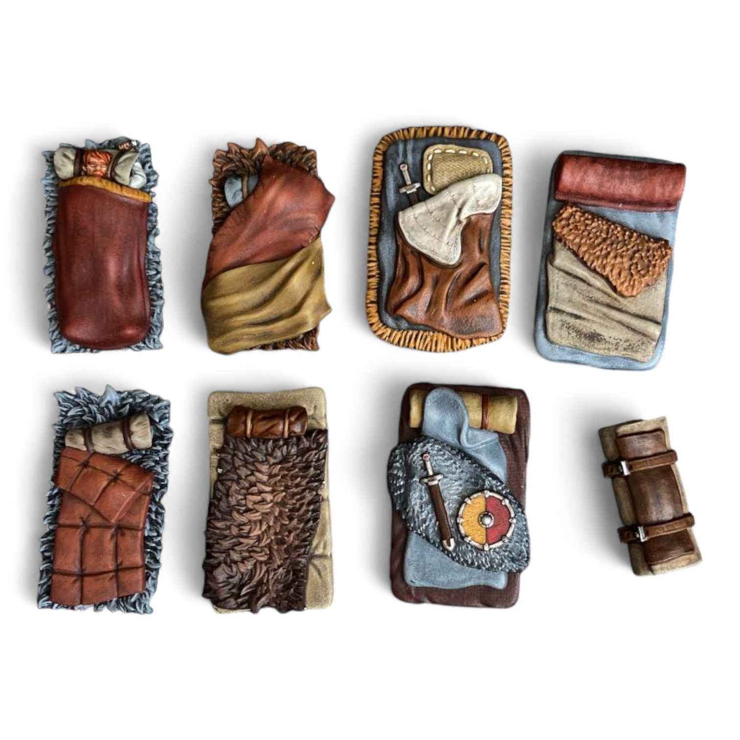 Набор из семи спальников и одной скрутки. В одном из спальников дремлет уставший приключенец.