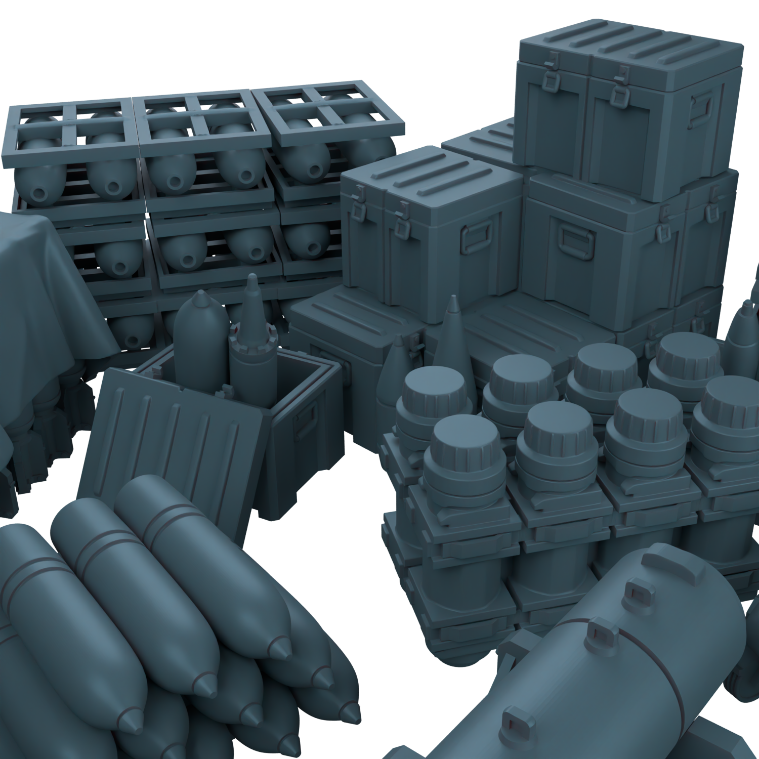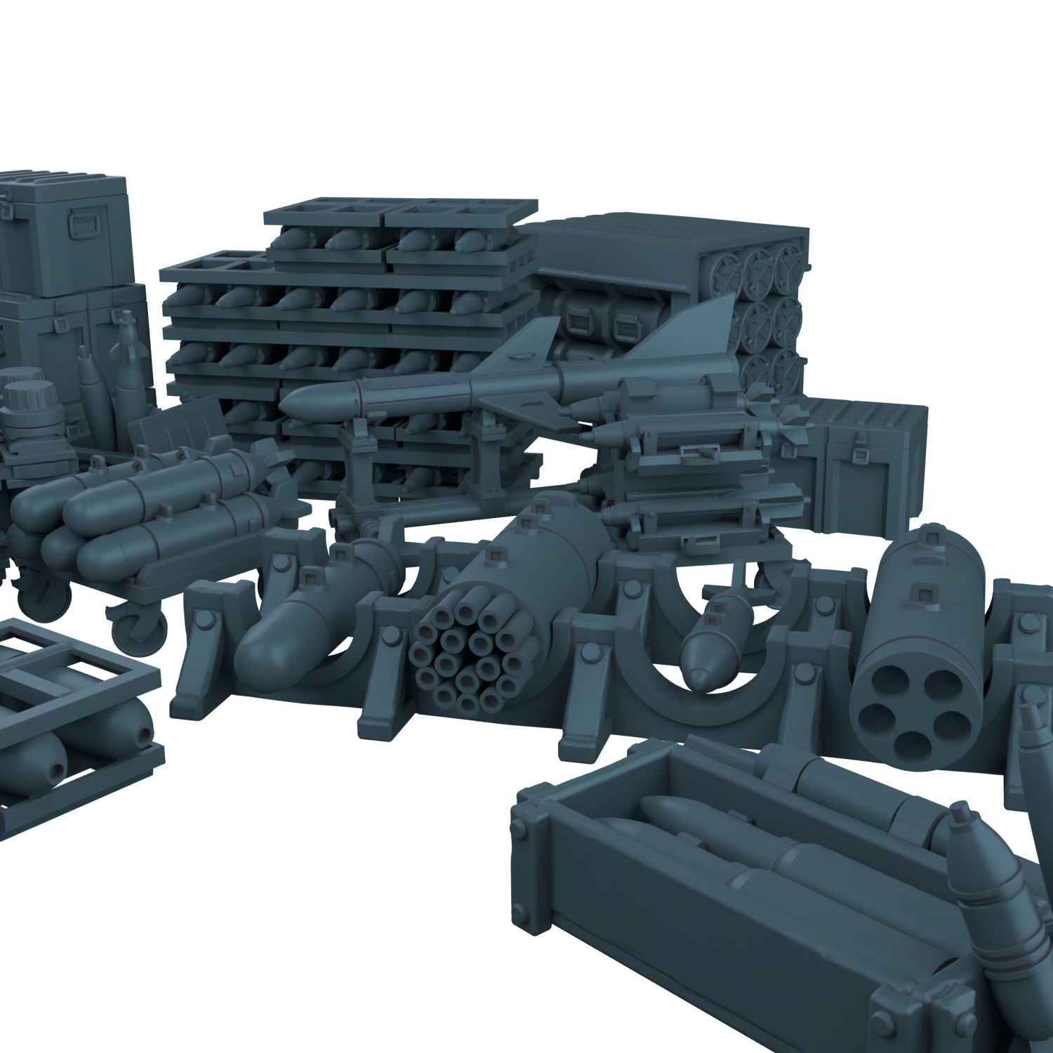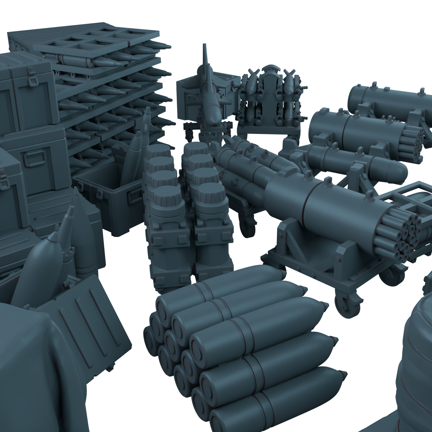 Здесь вы найдёте артиллерийские снаряды, авиационные бомбы на станках, груды армейских ящиков и даже небольшую ракету.