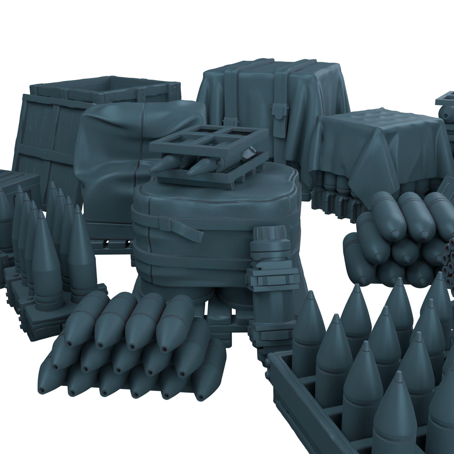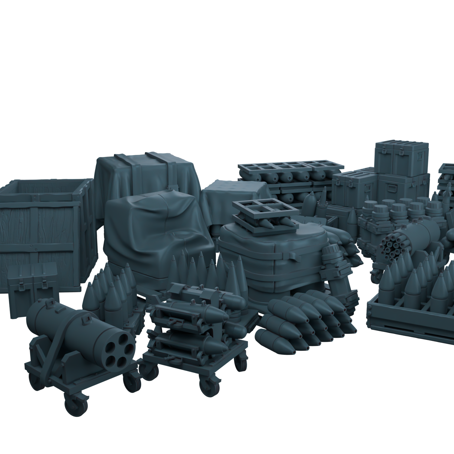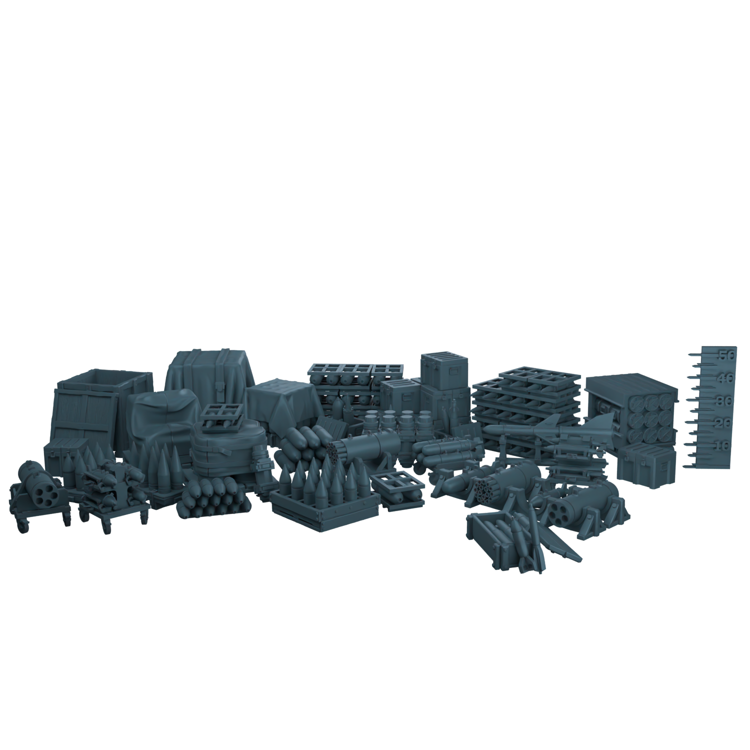 Здесь вы найдёте артиллерийские снаряды, авиационные бомбы на станках, груды армейских ящиков и даже небольшую ракету.