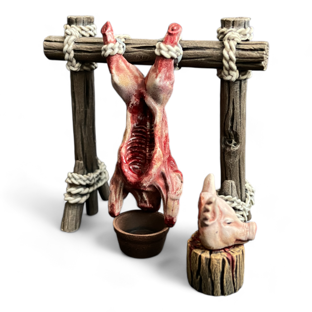 Рыночный ларек с небольшим навесом. Мясник недавно заколол быка и рад продать вам кусок парного мяса.