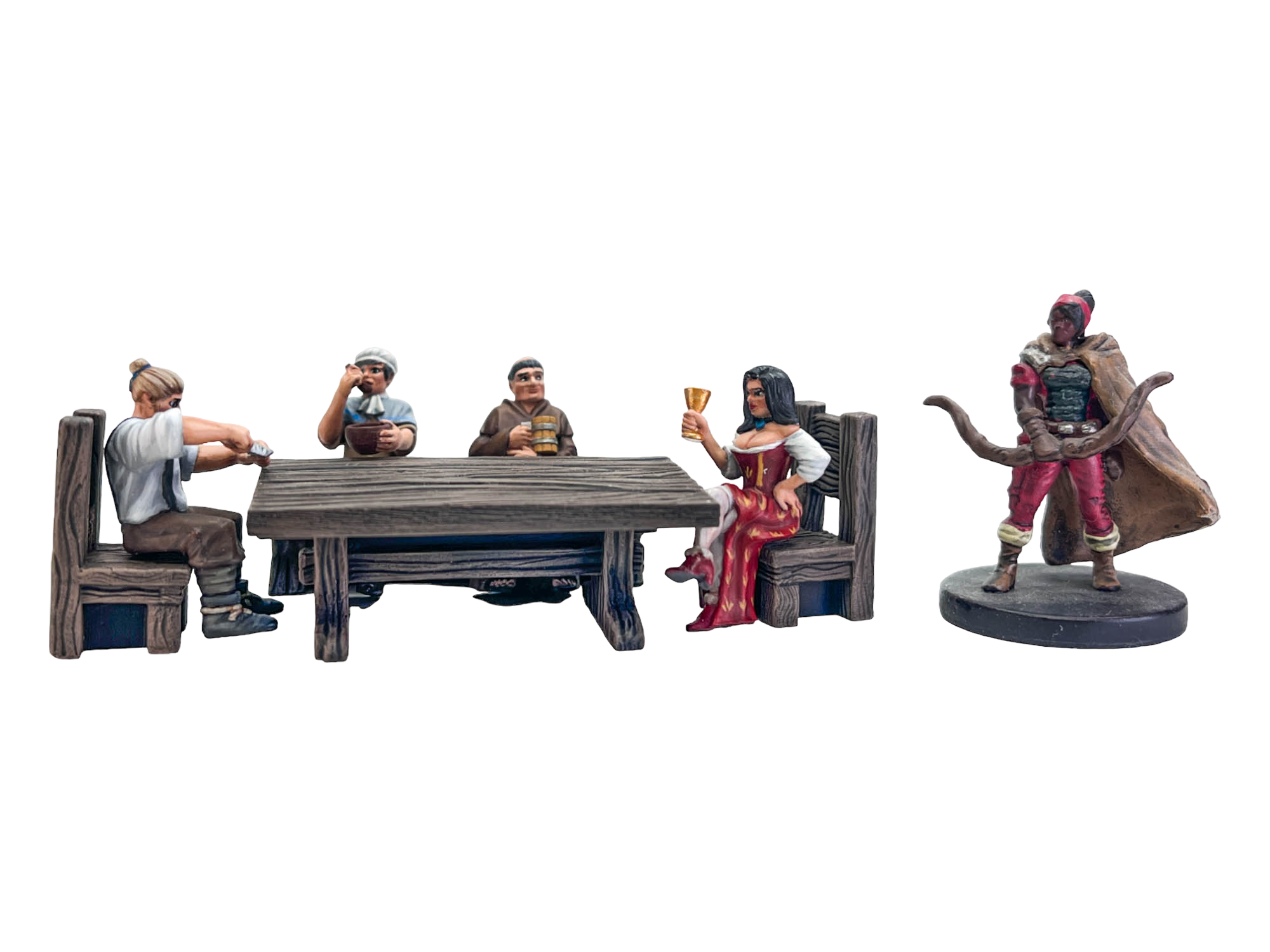 Набор "Обедаюшие горожане" из серии Sitting Folks — это сцена живого застолья: монах с кружкой пива, кухарка с похлёбкой, дерзкий малый с ножом и вилкой и красотка с бокалом вина. Всё, как в настоящей таверне.