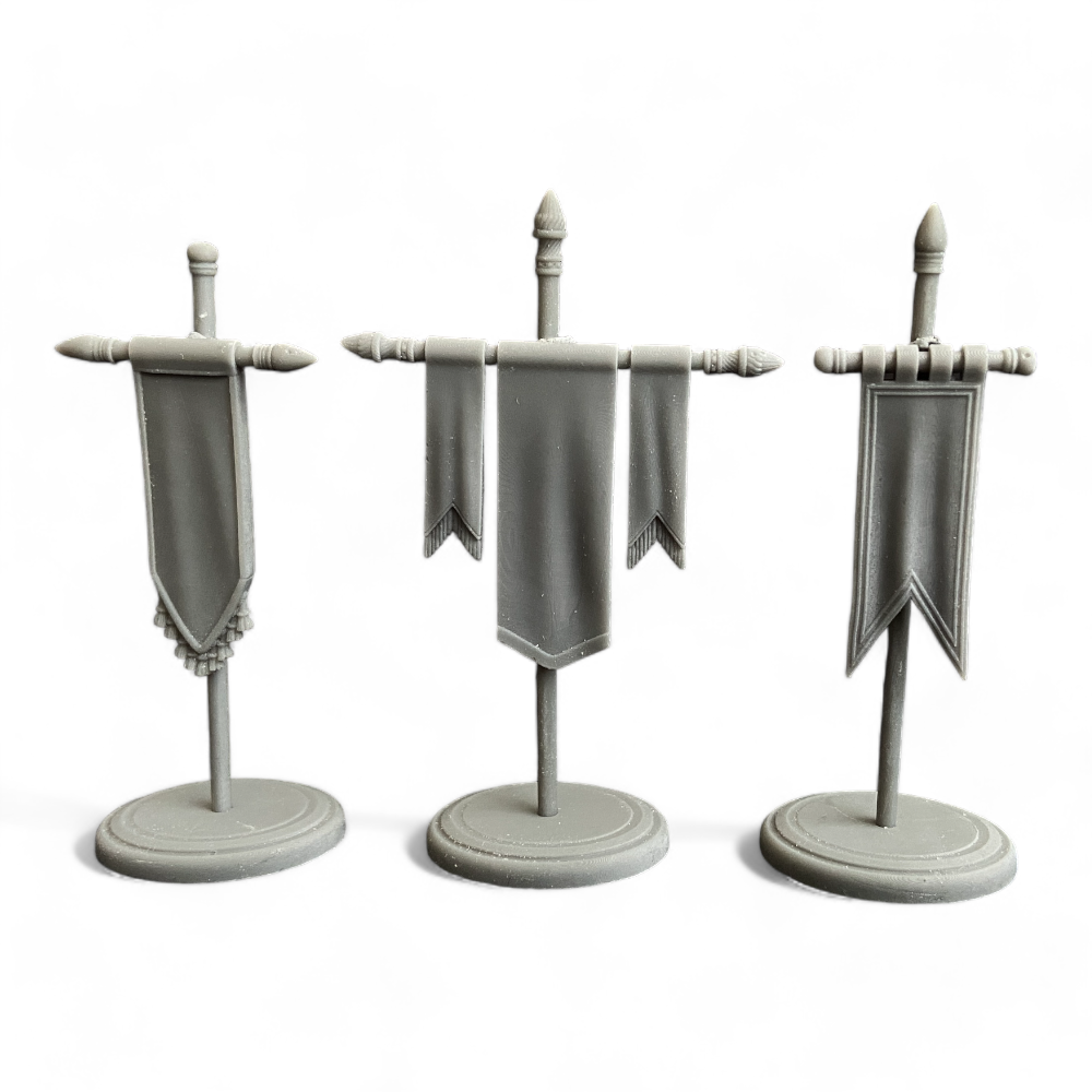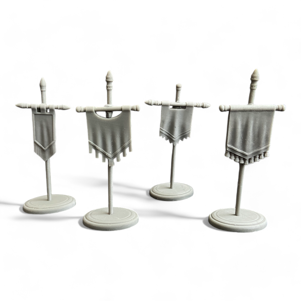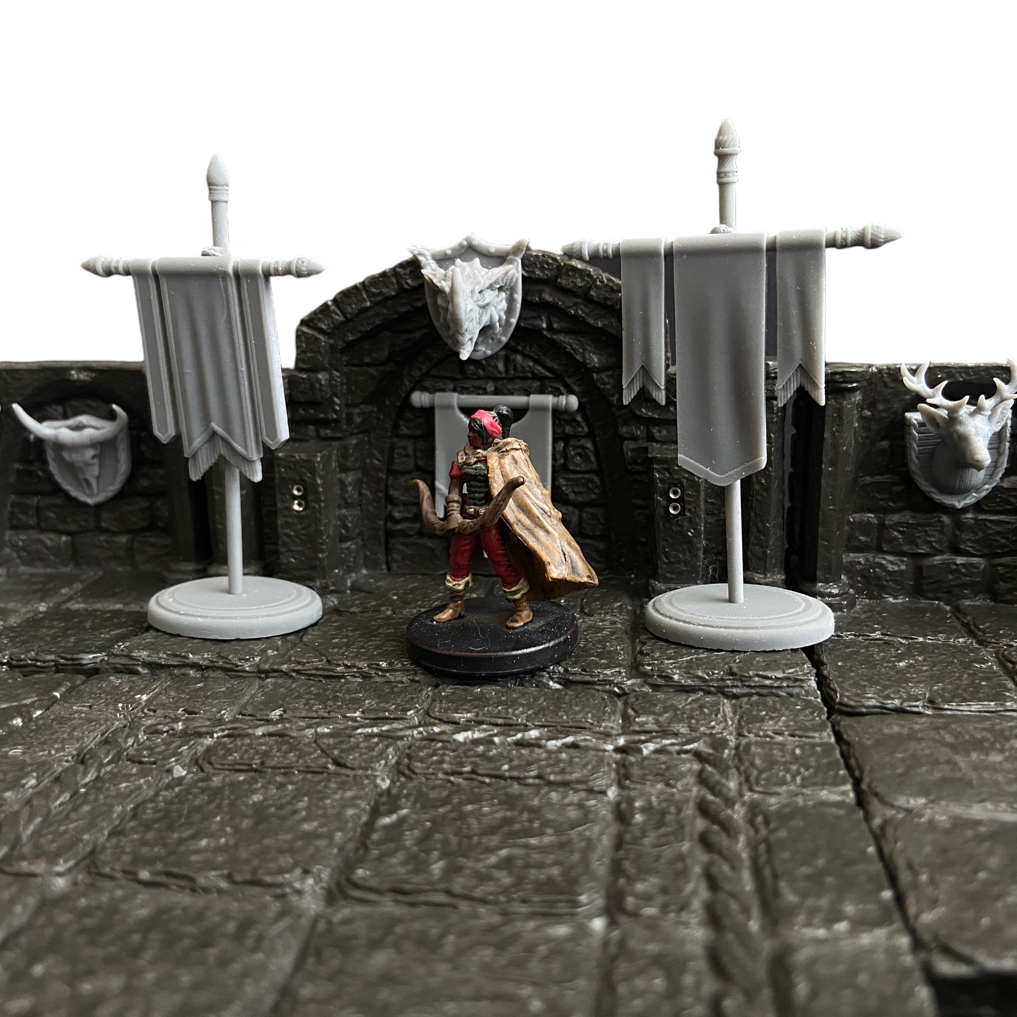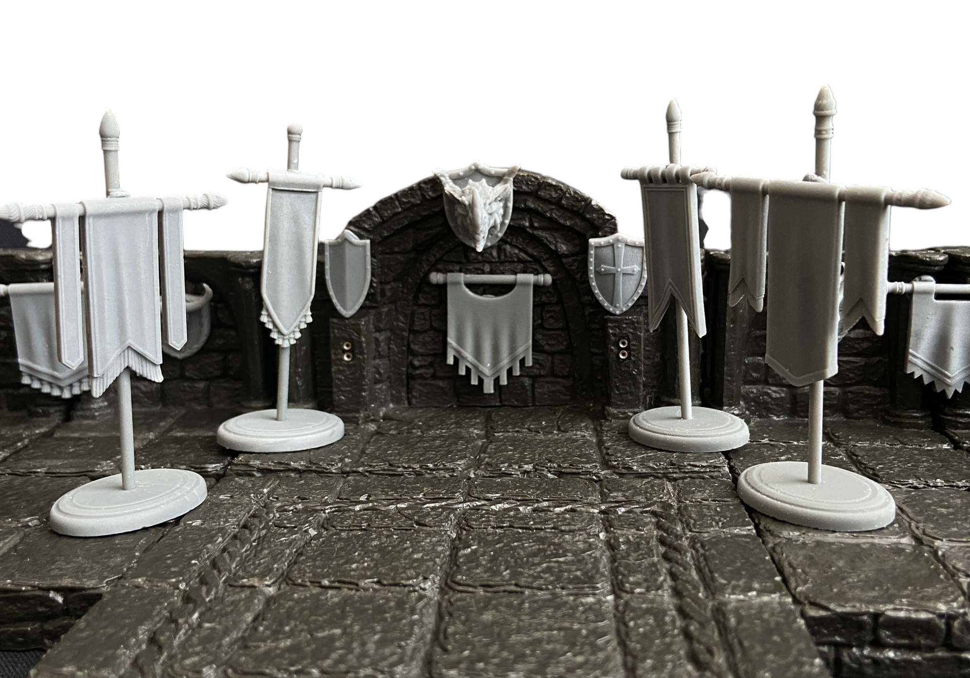 Флаги и знамена: Различные формы и размеры, предназначены для установки на шестах или подвешивания на стенах замка, добавляя королевский шик.